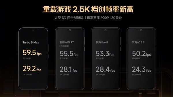 REDMI表示,天玑9500s出色的芯片级软件调校能力结合全新一代狂暴引擎,可显著提高主流游戏表现,重载场景的大型3D回合制游戏900P高清画质+60帧下,可实现30分钟59.5fps极近满帧的表现,创2.5K档新高,甚至越级胜出4000元档性能旗舰。